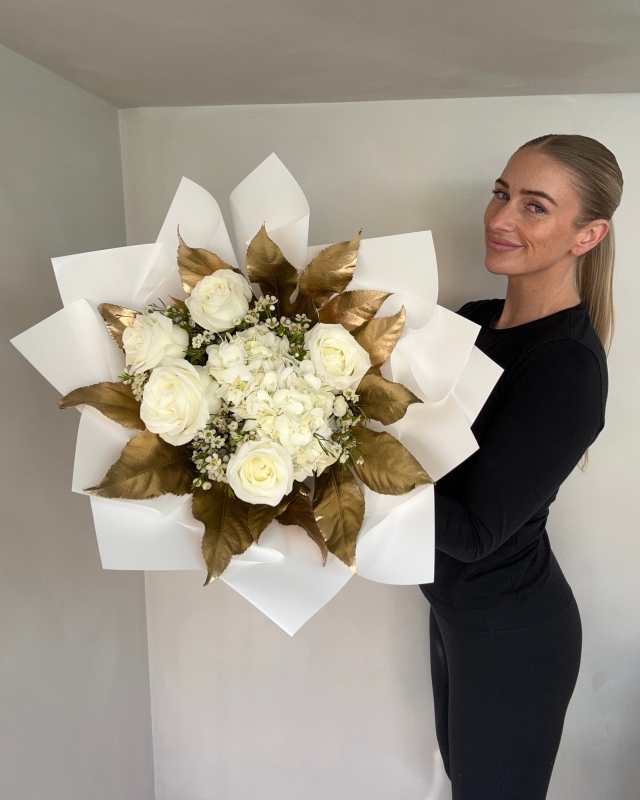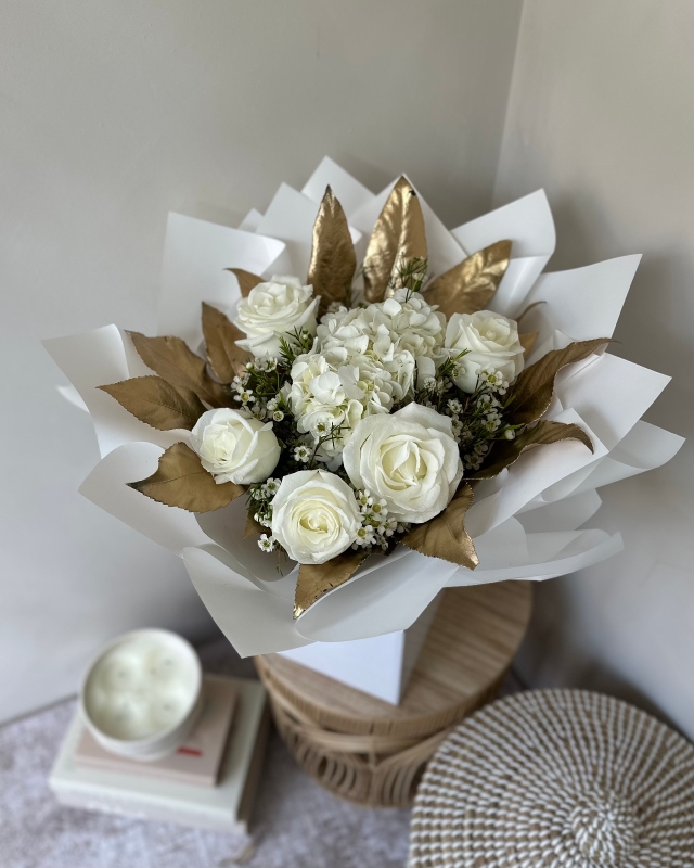 Each bouquet is thoughtfully arranged to create a soft, balanced composition of texture, fragrance, and natural movement. The crisp white tones are enhanced by an exquisite edging of sprayed gold leaf, adding a subtle shimmer and a sense of sophistication — perfect for marking a special occasion or simply elevating everyday moments.